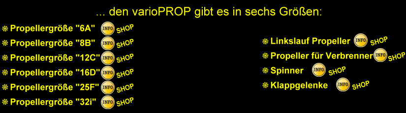 In jede Einstellnabe der Größe 6A, 8B oder 12C kann man Klappgelenke aus hochfestem Aluminium anstelle der Propellerblätter montieren. Somit kann mit einer Einstellnabe, die man vielleicht schon hat, eine klappbare Luftschrauben von 2- bis sogar 5-Blatt gebaut werden. |
