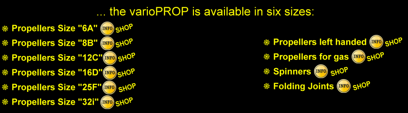 Propeller blades, which can be used with electric or gas engines. Due to the drive oscillations of a gas engine only special propeller blades may be used up to a reduced speed limit. |